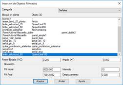 Además de lo explicado en el Modo Individual, este dialogo también nos muestra el PK Inicial y Final (tramo durante el cual se insertarán los objetos 3D), Intervalo (cada cuanto se va a insertar un Objeto 3D) y Desplazamiento (si es positivo se colocará a la derecha del eje, y si es negativo a la izquierda del eje).