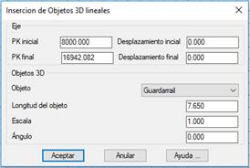 En este modo además de los parámetros anteriores también se podrá elegir el tramo del eje durante el cual se dibujarán los objetos 3D lineales, Pk Inicial y Final, y el Desplazamiento Inicial y Final del objeto con respecto al eje, si el valor es positivo se dibujará a la derecha del eje, y si es negativo a la izquierda.