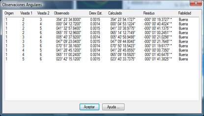 Las observaciones angulares son originadas por las lecturas desde una base a la anterior y la siguiente, o sus recíprocas. Estos valores se emplean sólo para el cálculo por mínimos cuadrados, y la lista no permite edición.