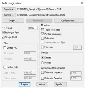 En primer lugar se especifica el modelo digital a partir del cual se desea obtener el perfil longitudinal. Para ello se pulsa el botón Superficies y se selecciona el fichero de superficies o de mallas a partir del cual deseamos generar el perfil, si es diferente al propuesto. Esta opción es solo necesaria en el caso de que utilicemos como fuente de datos un modelo digital o una fichero de mallas, en caso contrario, en la sección Origen seleccionaremos el modo  o las entidades a partir de las cuales se desea generar el perfil.