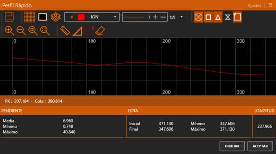 Este comando resulta muy útil para tener una idea del terreno de forma instantánea. Mediante esta orden se permite indicar el conjunto de líneas que define la traza del perfil que se desea obtener, y con ésta se representa en una ventana el perfil obtenido. La representación del mismo se puede escalar para apreciar con más nitidez los cambios de pendiente. Además, se rotulan la información de distancia y cota de cada uno de los vértices en los que se sitúa el puntero del ratón. Al validar el diálogo automáticamente se repetirá el proceso hasta que se cancele el mismo.