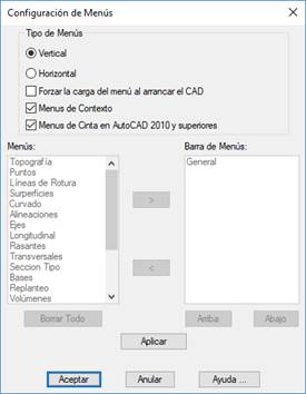 Aplicar : Actualiza la barra de menús del CAD con los cambios realizados.