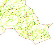 El programa cambia el color de cada línea de triangulación, asignando a cada una el código de color correspondiente al número de veces que está repetida cada línea. Por lo tanto, las líneas de los triángulos perimetrales, contorno e islas, y sólo ellas, se dibujan en color 1 (rojo), y las interiores sólo deben aparecer en color 2 (amarillo). De esta forma es fácil detectar zonas donde la superficie tiene huecos, donde no se puede calcular la cota del terreno, y por lo tanto el programa es incapaz de generar curvas de nivel, por ejemplo.