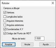 Este comando inserta una tabla en el dibujo con información detallada sobre una parcela seleccionada. En primer lugar el programa solicita la designación de la parcela y a continuación se muestra el siguiente diálogo: