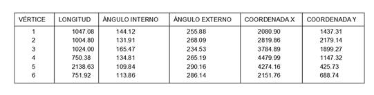 Ángulos exteriores. Ángulo que forma cada vértice con respecto a los lados adyacentes, medidos en el exterior de la parcela.