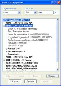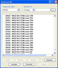 Muestra el listado de los SRC proyectados incluidos en la base de datos EPSG. También permite editar, borrar y crear nuevos SRC de usuario.