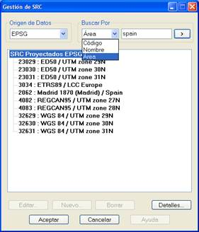 En el apartado Buscar Por se permite filtrar los datos de la consulta por Código, Nombre y Área. Esta última opción sólo está disponible para datos EPSG. El nombre de la zona (continente, país, etc.) se debe especificar en inglés. Se debe introducir la cadena a buscar en la casilla de la derecha y pulsar el botón
