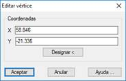 Con la opción “Editar vértice” podremos editar cualquier vértice del edificio así como cambiar las coordenadas del mismo. Validado el diálogo, si se han cambiado las coordenadas de algún vértice, el edificio se actualizará con sus nuevas coordenadas.