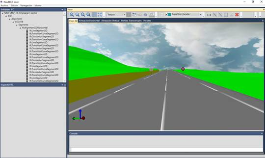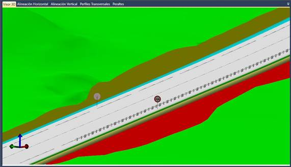 En la pestaña Visor 3D visualizaremos las superficies existentes en el fichero IFC (incluyendo movimientos de tierras: desmontes y terraplenes), así como las distintas capas de firme asociadas a cada eje del proyecto (si estuvieran definidas), las marcas viales y señalización (tanto señales puntuales como lineales). Se creará una nueva capa con el nombre de cada superficie o capa de firme en la cual se dibujará la misma.