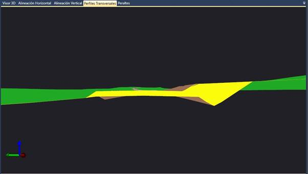 En esta vista podremos visualizar perfiles visuales de la vista 3D del proyecto. Para manipular esta vista es necesario emplear el control de navegación. Cuando establezcamos un eje y un PK podemos centrarnos en él y obtendremos, visualmente, el perfil transversal en dicho PK.