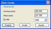 Los campos Anchura y Altura especifican las dimensiones en milímetros de la pantalla, que son calculados automáticamente por el programa. La casilla Escala indica el valor deseado del denominador de la escala.