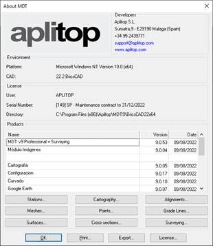 In addition, if the Stations, Cartography, Horizontal Alignments, Points, Grade Lines, Surfaces, Surveying or Cross Sections buttons are clicked, details about the file formats installed and their respective versions are displayed.