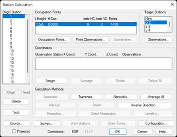 Origin Station. Allows one to select the station of origin. Once selected, the dialog box displays the instrument set-ups at this station, the stations and points measured, as well as the coordinates calculated.
