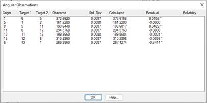 Angle observations are originated by station observations between a station, the previous station and the next station, or their reciprocal stations. These values are only used for the least squares calculation and cannot be edited.