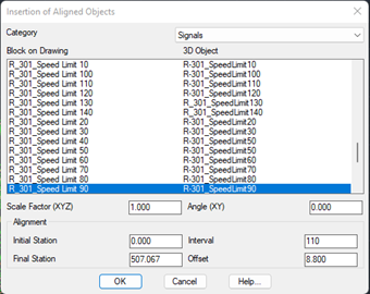 In addition to what is explained in the Individual Mode, this dialogue box also shows the Initial and Final Station (section during which the 3D objects will be inserted), Interval (how often a 3D Object will be inserted) and Offset (if it is positive, it will be placed to the right of the horizontal alignment, and if it is negative, to the left).