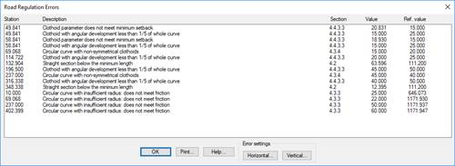 This command checks the geometrical characteristics of a horizontal alignment, in accordance with the road regulations configured in the program.