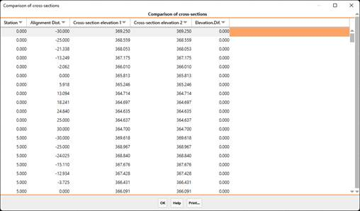 This command displays a list with the height differences for each station at the different cuts of each cross-section.