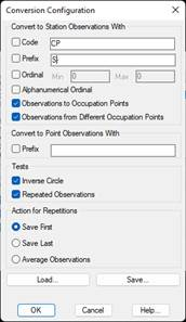 This dialog box is activated by clicking on the Configure button in format selection. It allows one to generically control of differences between point and station observations, in addition to any actions one may wish to perform should there be repetitions or inverse circle observations. Some of the formats available distinguish between different kinds of observation. In such cases, these options have no bearing on the conversion.