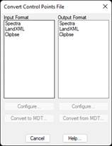 If a format is selected from the Input Format list, the Convert to MDT button will automatically be enabled. When this button is clicked, the source file containing the control points in the original format will be requested and then the output file will be requested to where the control point information will be sent in MDT format. Optionally, the Configure button can be enabled where some of the special characteristics of the format selected can be set.