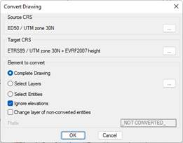This command allows you to convert an entire drawing from a source CRS to another destination CRS. After invoking the command, the following dialog is displayed: