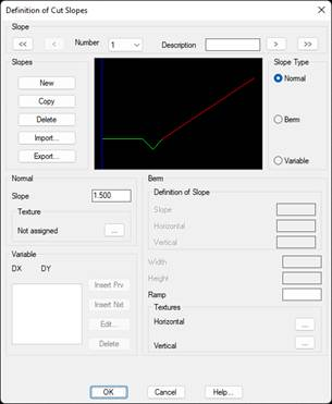 New: This creates a Normal type slope by default and assigns it the number following the last on the list. To define different types of slope, proceed as follows.