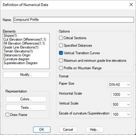 Users may interactively define the composition of any numerical data file by executing this command the numerical data for both long sections and cross-sections are defined by this command. Once Profiles > Definition of Numerical Data is accessed, the following dialog box is displayed: