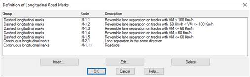 Road marks: By pressing this button we will see the following window from which the characteristics of each of the road lines will be defined. With the possibility of customizing them.