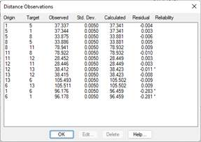 Distance observations contain the following information: origin and target stations, observed distance, standard deviation and residual. The corrections in force affect these values. An asterisk may appear to right of any observation, which indicates whether the difference between the observed and calculated values is within the tolerance.