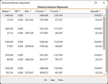 This tool provides users with information regarding distances equivalent stations existing on two different horizontal alignments. Firstly, the two horizontal alignments must be selected. Then the following dialog box is displayed: