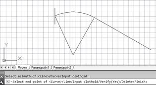 For the following elements the program starts with the final azimuth of the previous element and only the final point of the section has to be entered. By default, after a line the program proposes a circular element and after a circular section a line one. A clothoid can be entered with the option Input clothoid of the command line which interactively calculates the parameter and the final radius of the clothoid as the cursor is moved. After a curve, an Output clothoid can also be entered in which, maintaining the initial radius, the parameter is calculated interactively.