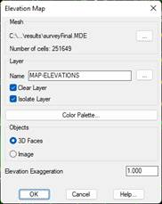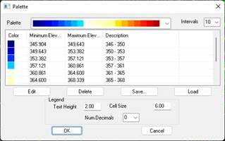 The Color Palette button shows the following dialogue which shows the elevation ranges, the color assigned and the different palettes available for assignment. The default configuration for intervals and the color palette may be edited in Map Configuration.