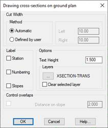 ·Automatic: In this case the width of the cross-section drawing in ground plan will be the one that corresponds in the selected cross-section file. So that depending on the width of each cut, there may be cuts with different right and left lengths.