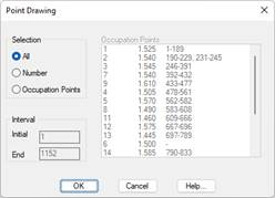 This command is executed through the Surveying > Drawing > Draw Points command or by clicking the Draw Points button in Station Calculations. One should firstly specify if one wishes to draw All the surveying points, a specific Number of them defined by an Initial and Final points interval or select Occupation Point to choose the set-ups one wishes to draw.