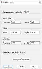 This utility allows curved or clothoid-type alignments to be modified. In order to do so, the alignment to be modified must be selected and the program displays the following dialog box: