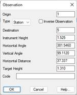 The Origin and Target check boxes display the name of the origin station as well as those of the station or point read. The Inverse Observation check box allows one to show whether one wishes to consider the observation as such.