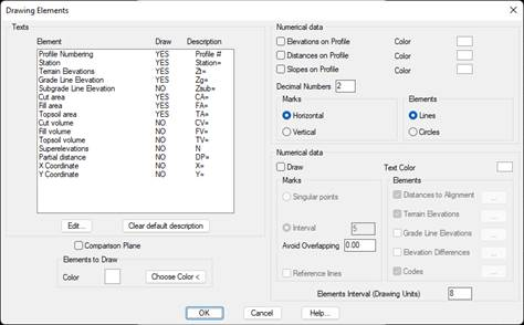 Numerical data: In this section the numerical data associated with the cross-section profiles is activated and configured: Terrain elevations, Grade line elevations, cut/fill, and codes, depending on whether a segment or a cross-section is selected.