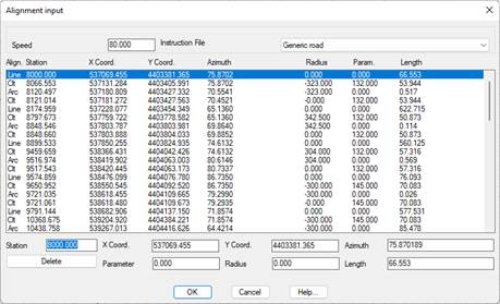 A list then appears showing the alignment’s unique points should they have existed previously. In the lower part, a there is a control for each of the alignment’s components, including: Station, XCoordinate, YCoordinate, Azimuth, Parameter, Radius and Length.