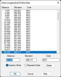 Possibility of entering or modifying a long section, element by element. Once this command has been executed, .LON file will be requested. Then a dialog box will be displayed containing the profile’s data should it exist or empty if no data has yet been entered.