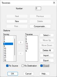 Lastly, the Compensate button allows access to the Traverse Adjustment dialog box. There should be at least one fixed station in the traverse.