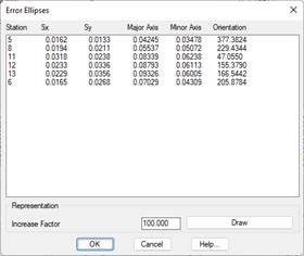 The Error Ellipses button displays information associated with the error ellipse for each of the mobile stations making up a Traverse, including: standard error rectangle size (Sx, Sy), sizes of the major and minor semi-axes and the Orientation of the ellipse. This information is shown for the confidence margin or probability percentage set in the configuration.