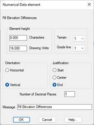 This numerical data element will only be drawn if the segment contains a defined grade line. It represents the height differences of the grade line’s fill with regard to the long section contained in the segment selected. The dialog box shown below is then displayed A description of its characteristics follows.