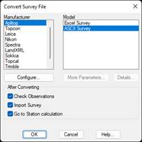 Once the dialog box has been accepted, the program displays a source file selection window in which one highlights the file one wishes to convert to the program’s format. The program then requests a file name for the survey file.