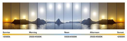 Set the color of the light source. By clicking on the square, a color can be selected. Clicking on the circle sets the temperature of the light source in degrees Kelvin. In this graph you can see the relationship of color and temperature for the interval 2000-4500 Kelvin: