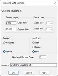 This is the same as the previous numerical data element but in this case with the grade lines. This element will only be available in the Draw compound profile command. The dialog box is displayed below with a description of its characteristics.