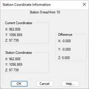 ·Station coordinates: When stations are drawn, all the coordinate assignments of each station are drawn by means of points on the SURV_STATION layer (see the Draw Stations command for further details), in addition to representing their exact position by means of blocks determined by their current coordinates. If the station’s surroundings are amplified using the zoom, one can view these points and obtain information on them by using this command. The station coordinates, point coordinates and the difference between them are displayed.