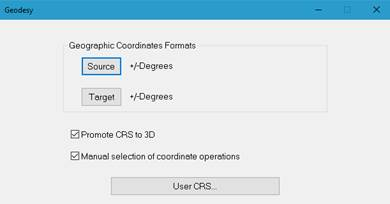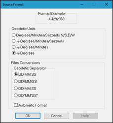 The geographic coordinate format is configurable and presents the following options for setting input and output settings: