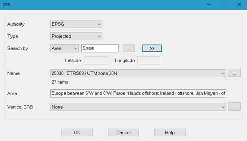 - Authority: Selects the authority that provides the geodesic database. The available options are: EPSG, ESRI, IGNF and USER. The selection of the latter one shows the list of the coordinate systems created by the user. For managing them, refer to the introduction of this chapter.