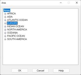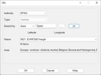 - Search by: Sets the search filter for coordinate systems. You can choose between Area, Code, Name and Location. For the latter, latitude and longitude must be entered in decimal degrees, between -90.0 and 90.0, for latitude, and -180.0 and 180.0, for longitude. In case of selecting the Area option, apart from manually entering the name, you can select from the list that is displayed by pressing the ellipsis button, to the right of the edit box: