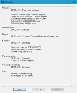 - Name: Displays the list of coordinate reference systems resulting from applying the parameters discussed above. The name of each system is composed of the code and description, separated by colon. The button on the right of this list allows one to show the details of the selected coordinate system.