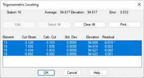 The program calculates the initial approximation by averaging the heights obtained for each observation. It then employs the least squares adjustment method. The screen displays the definitive Elevation and the Maximum Error. The results report has the following format: